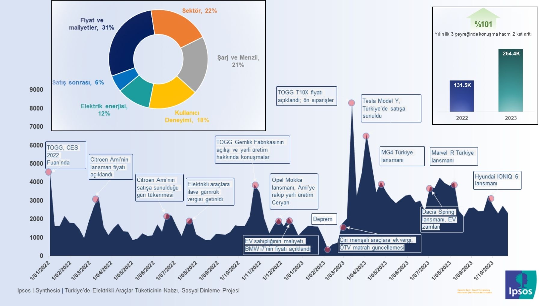 Sosyal medyadaki tüketici içeriklerinin hacmi 2023’te ve özellikle Togg ve Tesla lansmanlarının gerçekleştiği Mart-Nisan aylarında önemli bir artış gösterdi.