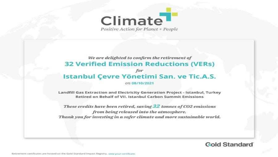 Çevre ve Şehircilik Bakanlığı ve İstanbul Teknik Üniversitesi (İTÜ) ana desteğinde Sürdürülebilir Üretim ve Tüketim Derneği (SÜT-D), 7. İstanbul Karbon E-Zirvesi’ni 28 Eylül 2021’de çevrimiçi gerçekleştirdi. Dijital etkinliğin öncesinde ve etkinlik süresince elektrik tüketimi kaynaklı sebep olunan sera gazı miktarını saptamak için SÜT-D Zirve Kurulu ve İSTAÇ Karbon Dengeleme Ekibi çalıştı. E-posta trafiği, dijital platform tasarımı, web sitesi çalışmaları, etkinlik firması ve Zirve Kurulu faaliyetleri için elektrik tüketimlerine karşılık gelen sera gazı salım miktarları hesaplanarak, 31,80 ton karbondioksit eşdeğeri sera gazına sebep olunduğu, bu emisyonun %99,6’sının ise etkinlik öncesinde veri için tüketilen elektrikten kaynaklandığı saptandı. Küresel sıcaklık artışına neden olan bu emisyon, İSTAÇ Çöp Gazından Elektrik Üretim Tesisi’nden elde edilen karbon kredisi ile sıfırlanarak, Doğrulanmış Emisyon Azaltım Sertifikası (VER) ile 7. İstanbul Karbon E-Zirvesi iklim dostu oldu.