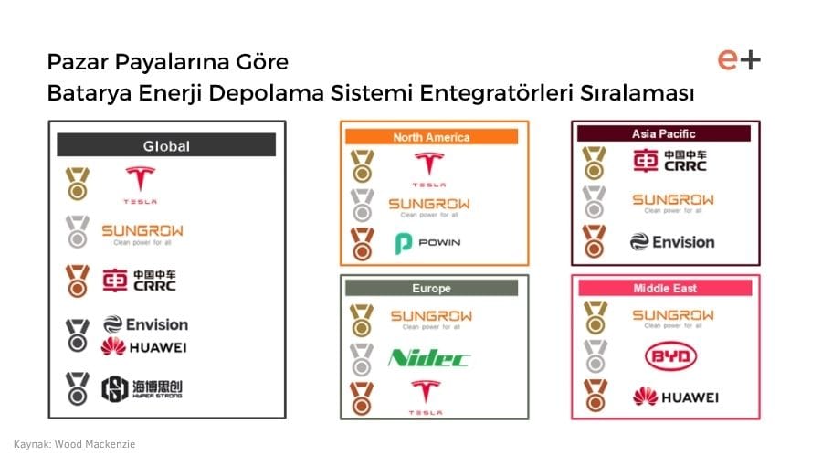 Tesla tacını korurken, Çinli rakibi Sungrow aradaki farkı önemli ölçüde daralttı ve %14 pazar payıyla ikinci sıradaki yerini korudu. Bu durum, Tesla’nın 2023’teki %4 puanlık üstünlüğünü 2024’te sadece %1 puana düşürdü. CRRC ise %8 pazar payıyla ilk üçü tamamlayarak üst üste ikinci yıl aynı podyumdaki yerini korudu.